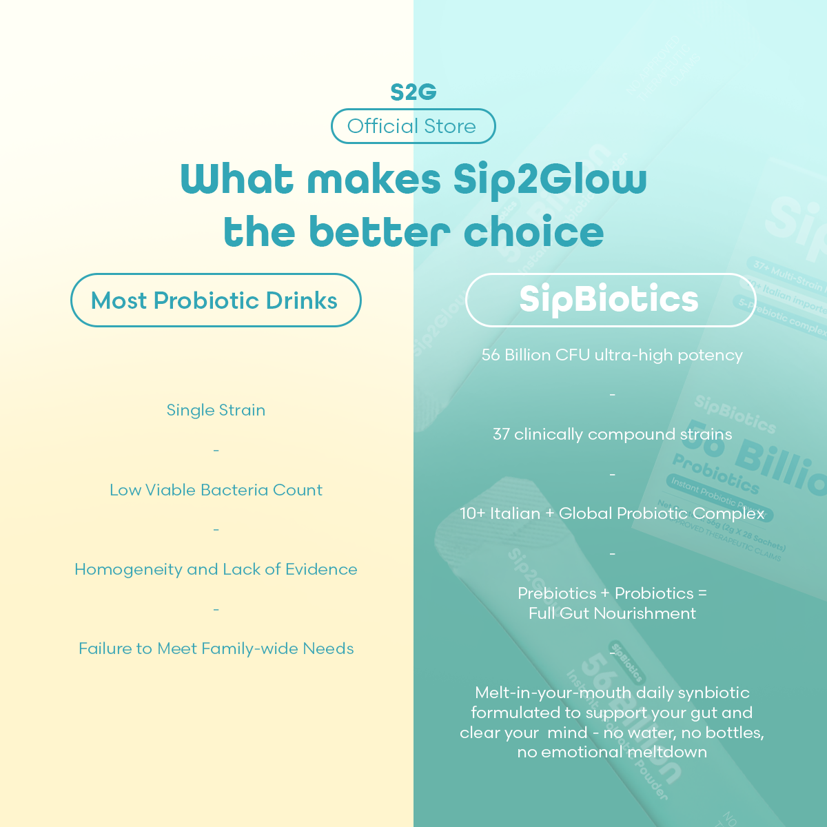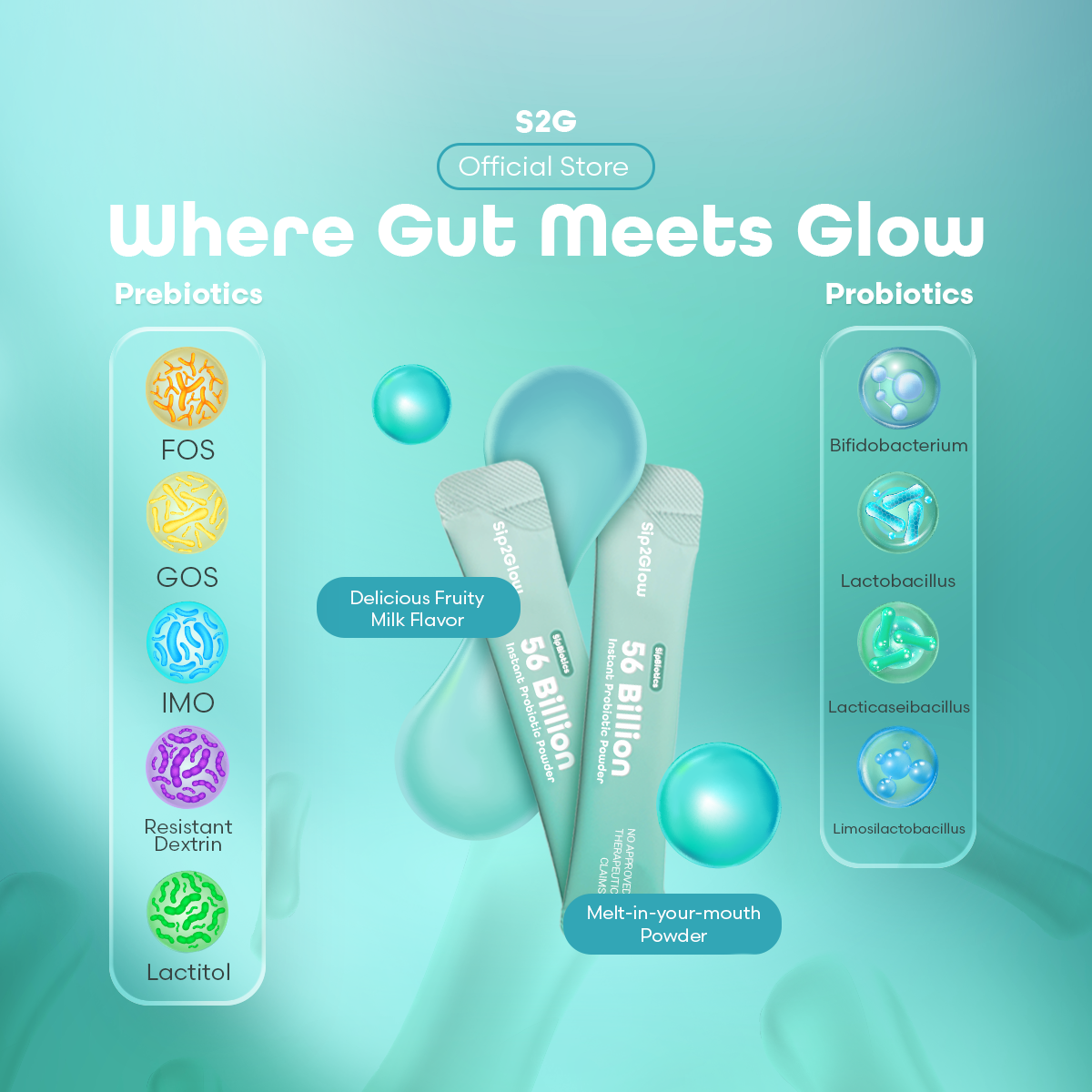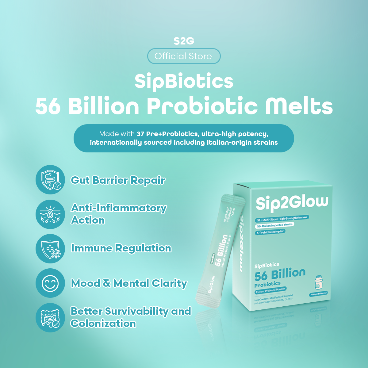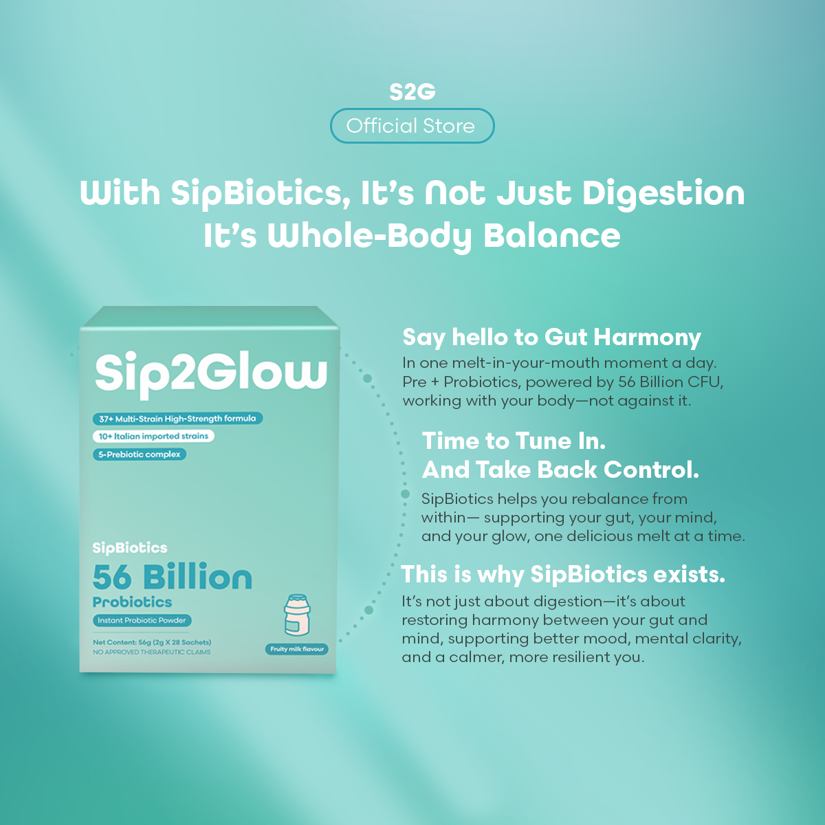 Formulated with 56 billion CFU and our exclusive 37+ strain synbiotic formulation from Italy, SipBiotics Instant Probiotic Powder delivers balanced gut health and immune support in each fruity milk-flavored sip.